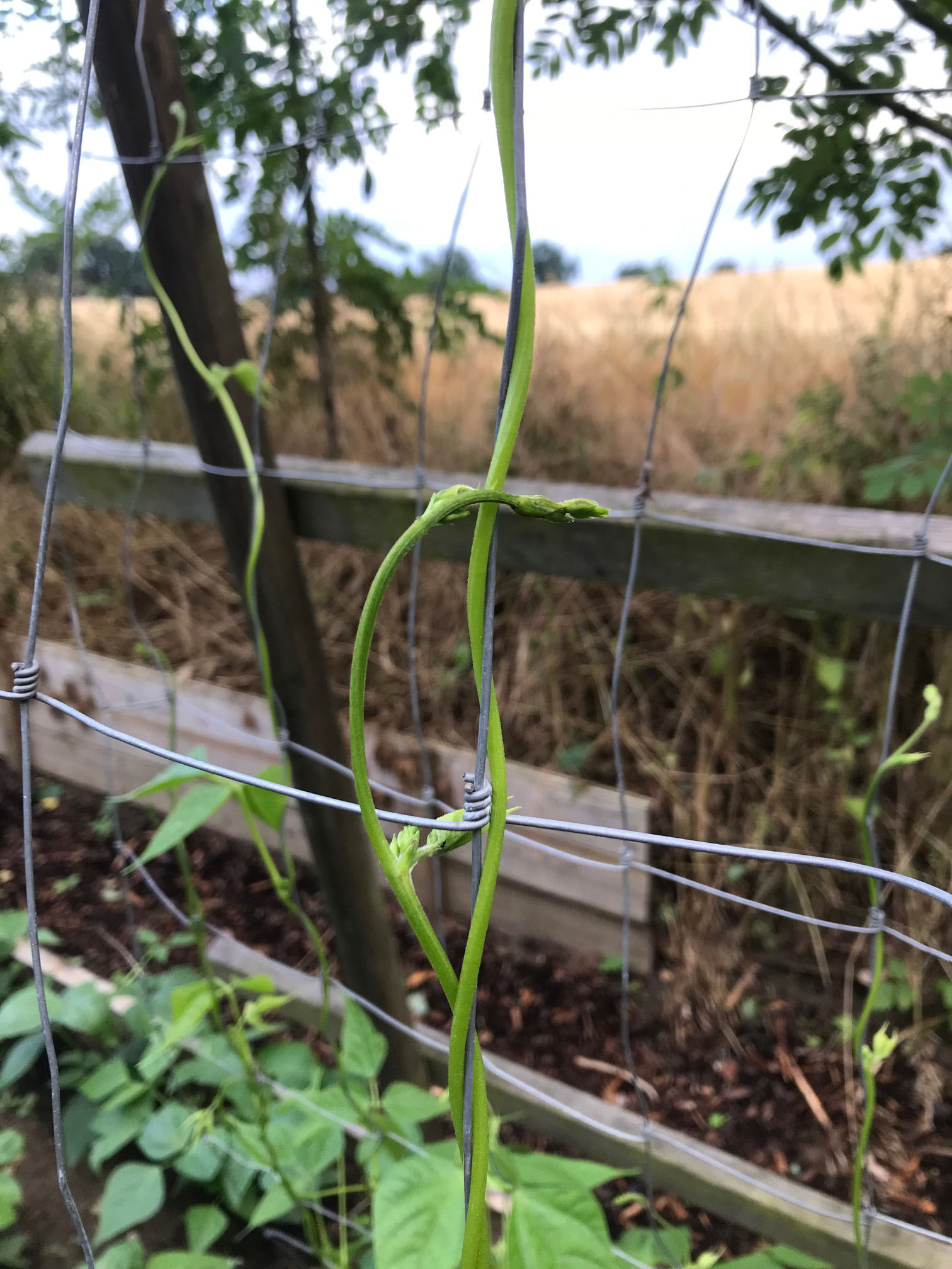 Die Stiegen allein reichen allerdings als Rankhilfen für Stangenbohnen nicht aus. Und Triebe, die sich am Boden herumquälen und keine Aufstiegshilfe finden, sind anfälliger etwa für Pilzkrankheiten. Eine einfache und gute Lösung ist hier ein Stück Weidezaun. Den bekommt man auf einer Rolle in verschiedenen Zaunhöhen und -längen im Fachhandel oder im Baumarkt. Häufig werden auch Reste bei Kleinanzeigen angeboten, die reichen meist locker aus.